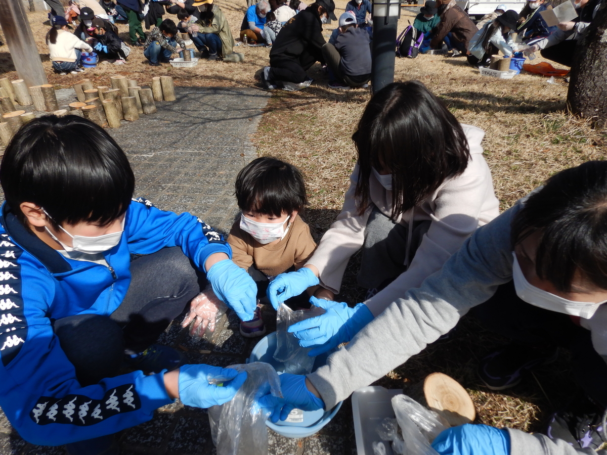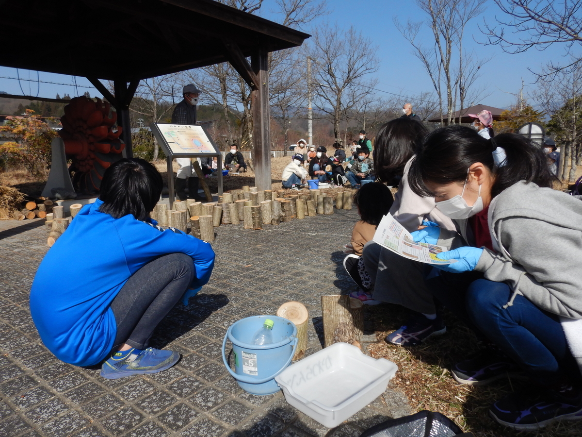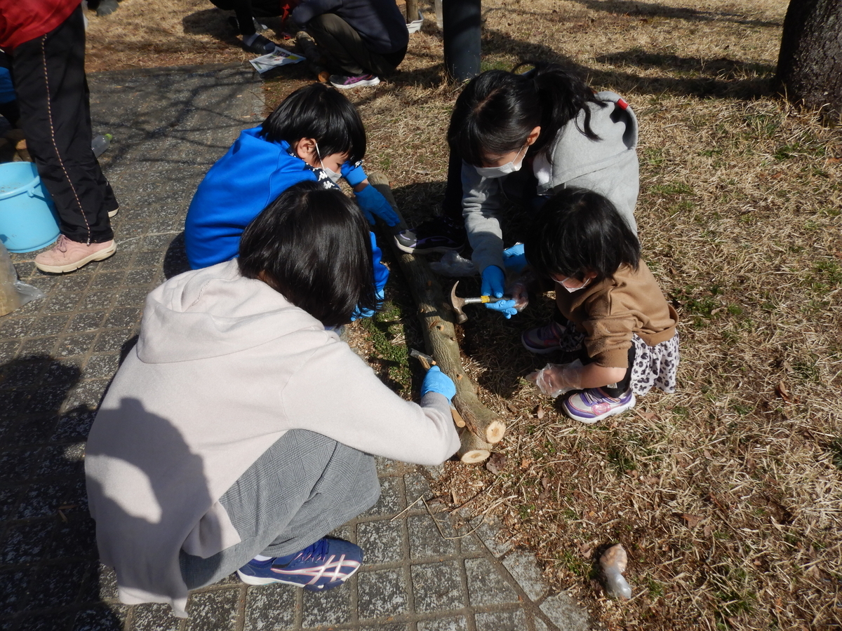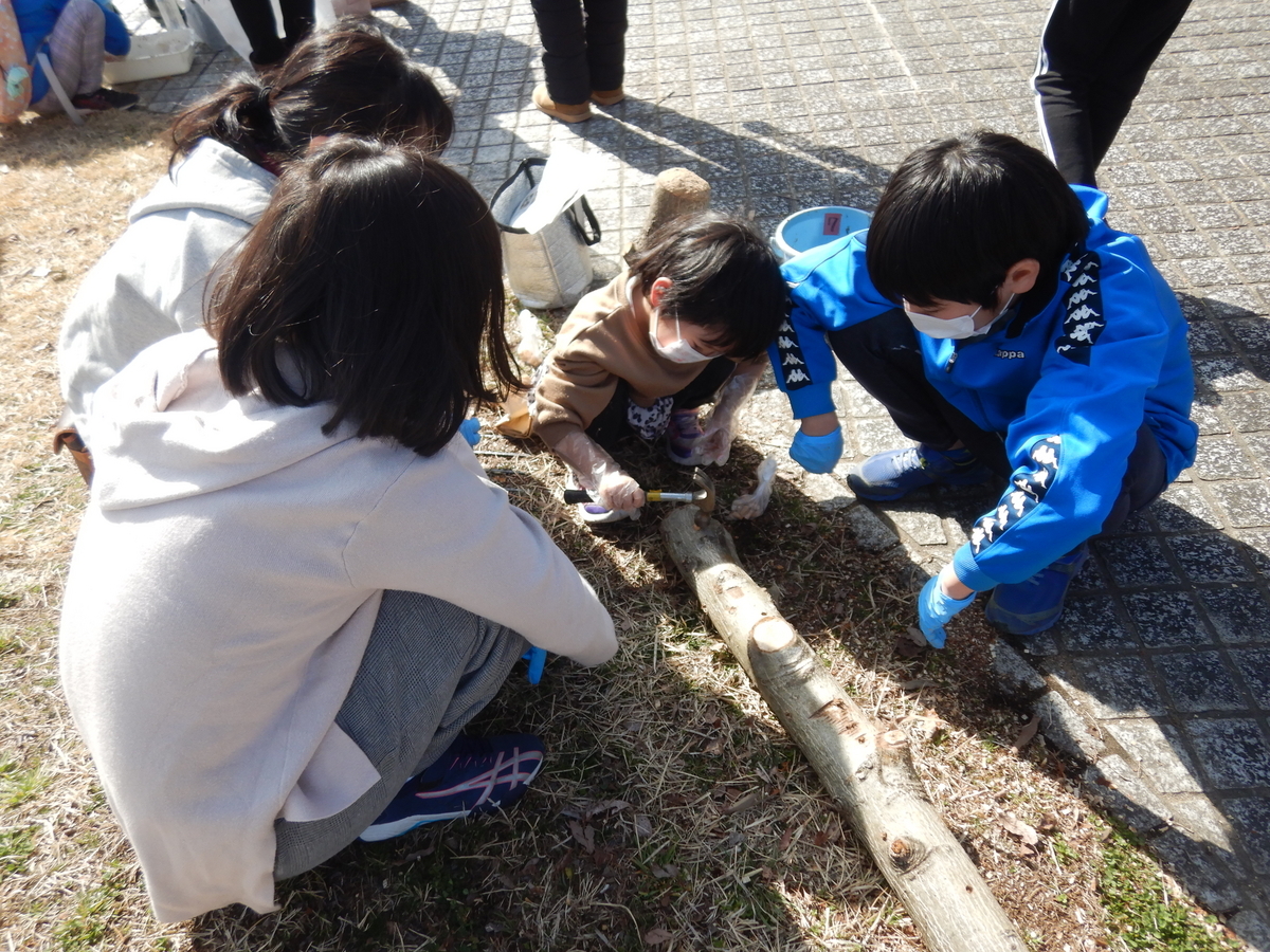 最後は、ヒラタケやシイタケの菌の付いた樹木を、土のなかに並べて終了です。